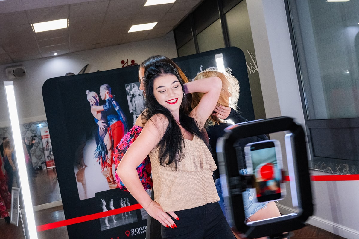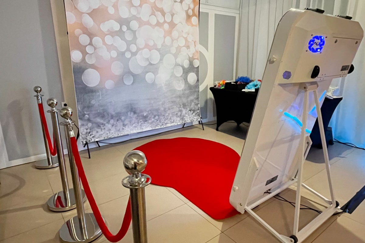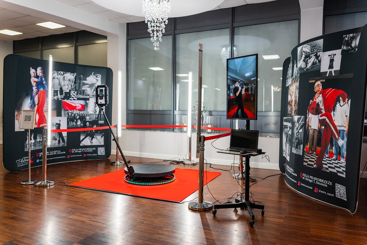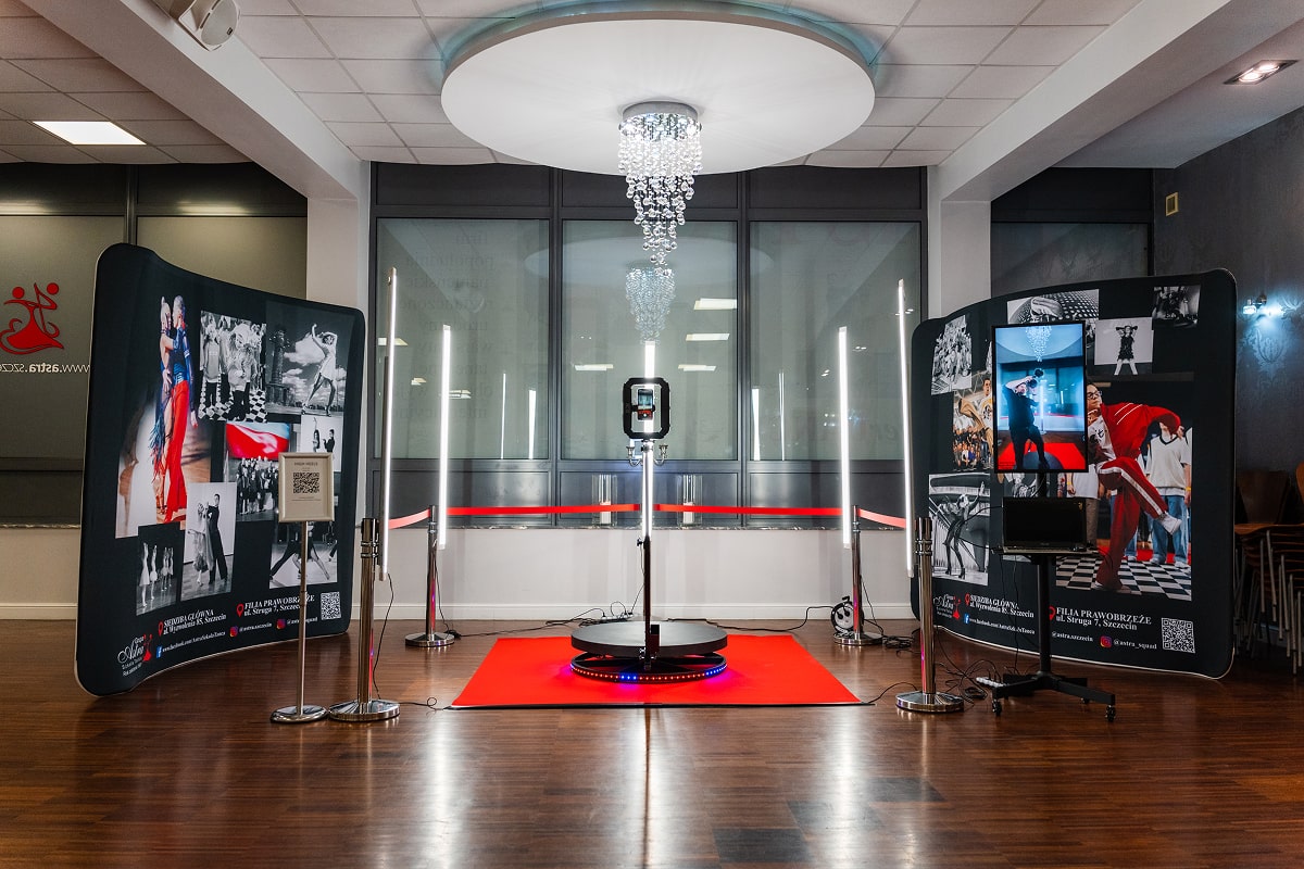 Stań na platformie i poczuj się jak gwiazda na czerwonym dywanie. Kamera obraca się wokół Ciebie, rejestrując krótkie filmiki w jakości premium – z efektami slow motion, które robią furorę na Instagramie i TikToku. Goście dostają nagrania od razu na swoje telefony, więc zabawa trwa jeszcze długo po imprezie.